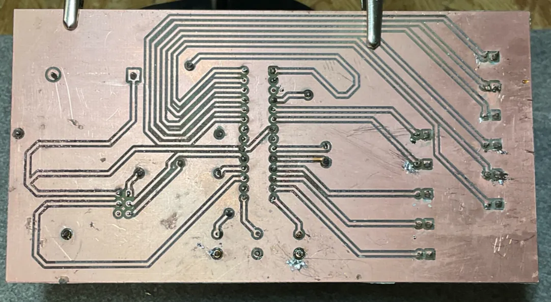 Die Leiterplatte wurde mit KiCad entworfen und anschließend mit der CNC-Fräse der HTWK gefertigt. Die Platine konnte von beiden Seiten bestückt werden, was beim Leiterplattendesign berücksichtigt werden musste. Wichtig waren hier vor allem zu beachten, das alle Anschlüsse des ATmega korrekt platziert sind, um eine einfache Verdrahtung zu ermöglichen.